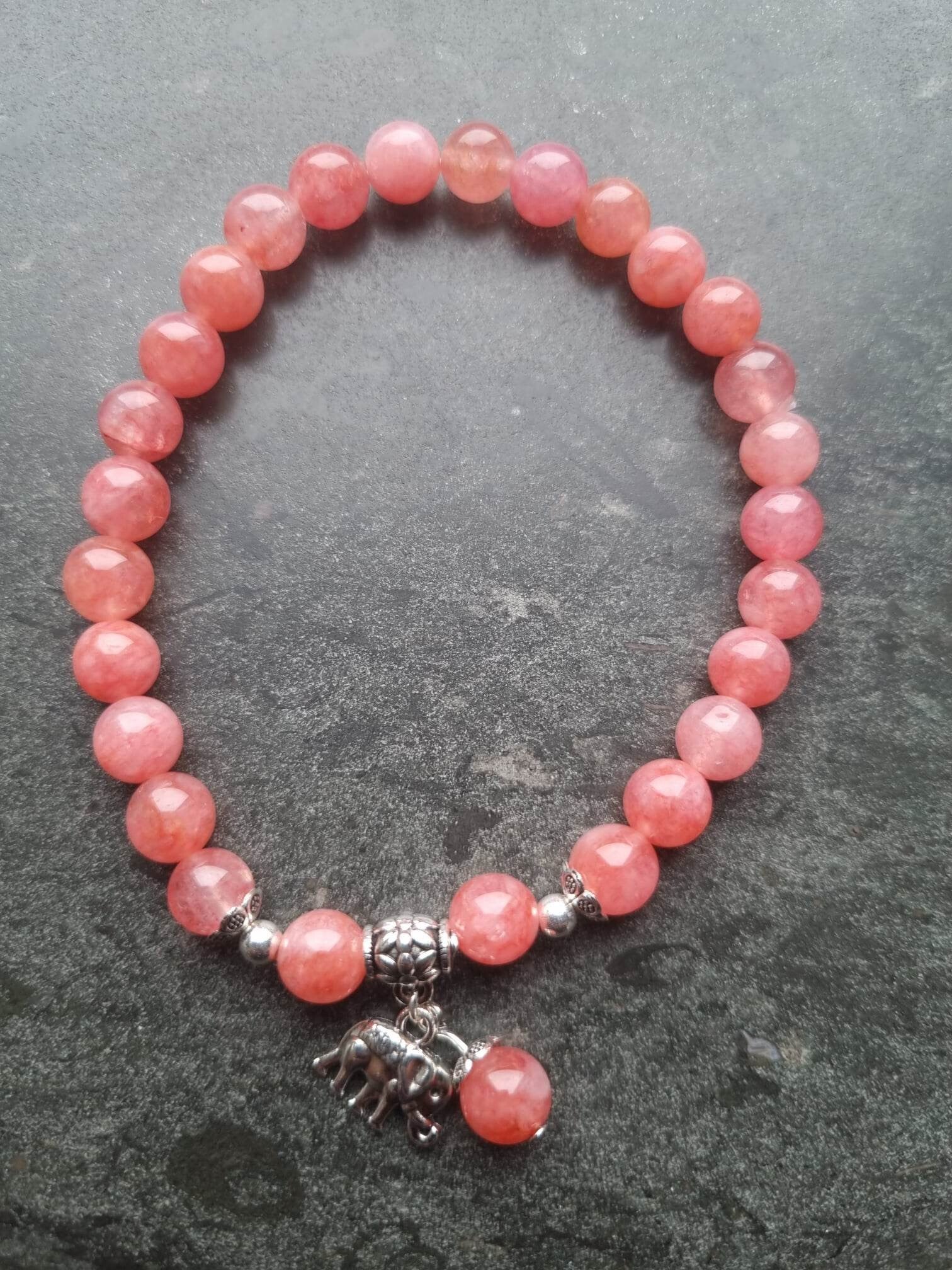Armband Edelsteen met Tibetaanse olifant en kraal bedel, kralen 8 mm geregen op elastiek, lengte 18 cm.